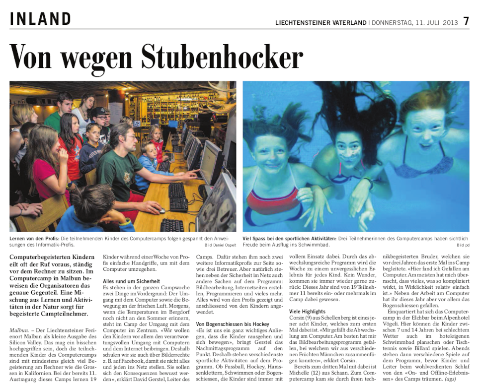 Das Computerabenteuer beginnt jeden Morgen und sorgt für eine spannende Reise in die Welt des PCs und Internets. Vollpension in Doppel- bzw. Dreibettzimmern im Alpenhotel ist ebenso selbstverständlich wie die Betreuung rund um die Uhr. In der einwöchigen Computerreise erlernen die jungen TeilnehmerInnen spielerisch die Grundlagen von Bits und Bytes. Doch sollen sie beim schönsten Wetter den ganzen Tag vor dem PC verbringen?! Wir zeigen ihnen, dass es sich sehr wohl lohnt, den PC auch mal abzuschalten: Wir bieten den ganzen Vormittag Spiel & Spass am Computer & Internet, doch dann geht's raus an die frische Luft, hinein in ein abwechslungsreiches Freizeitprogramm mit sportlichen Aktivitäten und Erlebnissen in der Natur.